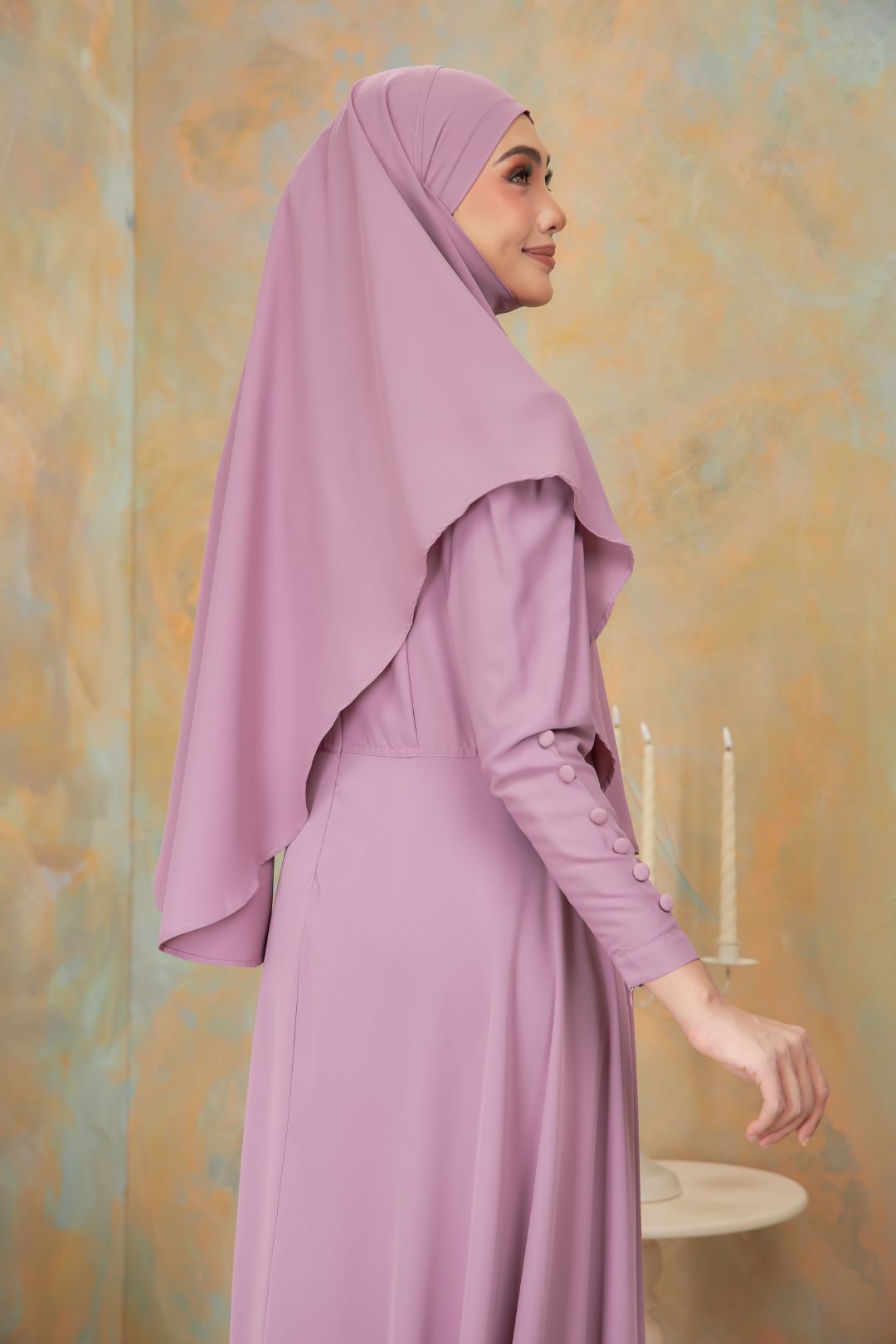 Khimar Needa Arabic Exclusive is crafted from premium Arabic Dubai Exclusive fabric that is cool, thick, non-sheer and flows gracefully for a luxurious drape. Designed in a tie-back style for easy wear without the need for an inner scarf. Available in 10 stunning colours: Black, Dark Blue, Magenta, Dark Chocolate, Mauve, Chocolate, Sand, Grey, Soft Pink, and Yum Purple. Comes in two khimar width (47” and 57”) and two face opening sizes (S and L) to ensure a perfect fit for every wearer.